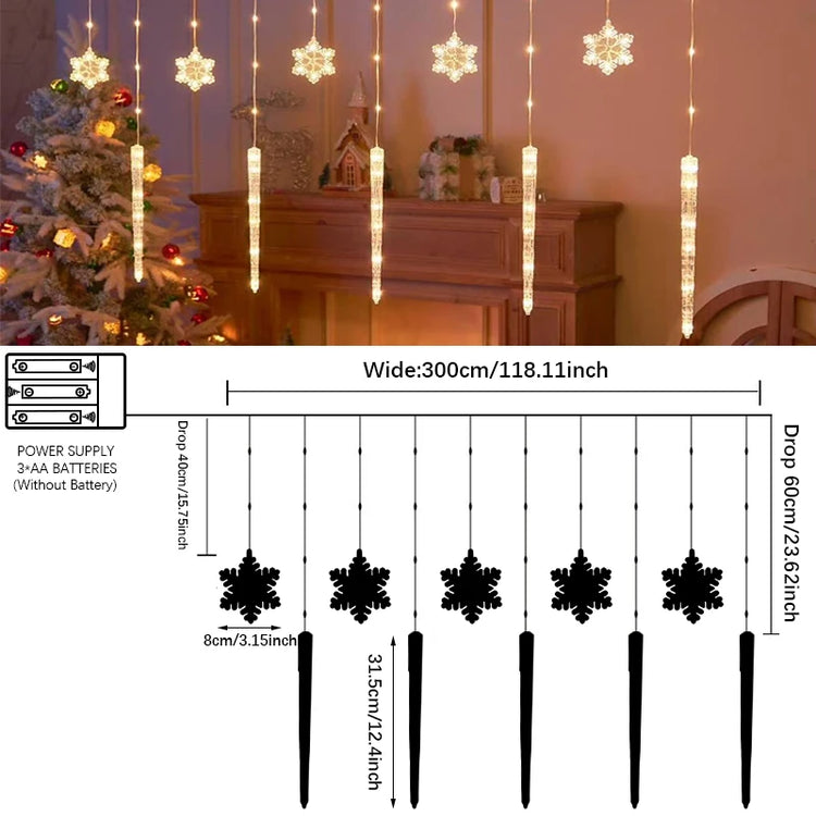 Size Information: The curtain light has a width of 300cm/118.11inch, with snowflakes of 8cm/3.15inch in size and icicles of appropriate lengths, creating a beautiful hanging display.